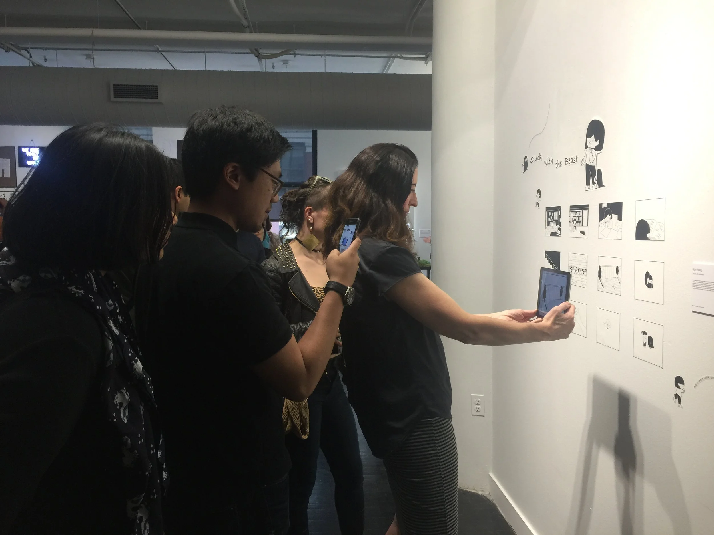 The project was exhibited in both academic and public-facing spaces, where viewers experienced the work through handheld AR interaction.